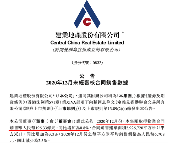 成也棚改,败也棚改 随着国内房企2020年年报披露在即,按照建业地产最新销售数据,全年业绩尽管大概率不及去年同期,但应该也不会太差。 1月7日,建业地产公布了2020年12月及全年销售数据。12月单月,建业地产取得物业合同销售额196.33亿元,同比增加0.8%。