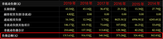 而到了2019年,全年负债总额直接突破千亿,达到1313.65亿元,同比增长43%。