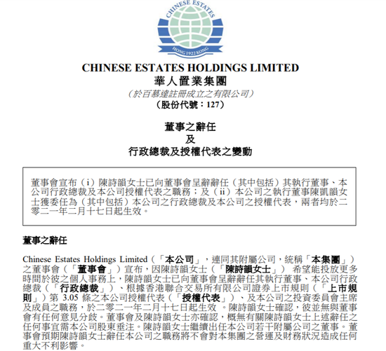 华人置业(00127-HK)公布,陈诗韵女士已向董事会呈辞辞任其执行董事、行政总裁及授权代表之职务;及执行董事陈凯韵女士获委任为行政总裁及授权代表,两者均于2021年2月17日起生效。