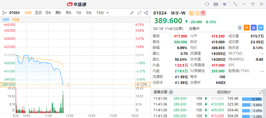 华盛资讯2月18日消息,快手盘中急速下跌超6%。截至发稿,快手跌6.12%,现报389.6港元,暂成交23.55亿,当前总市值为16203亿港元。