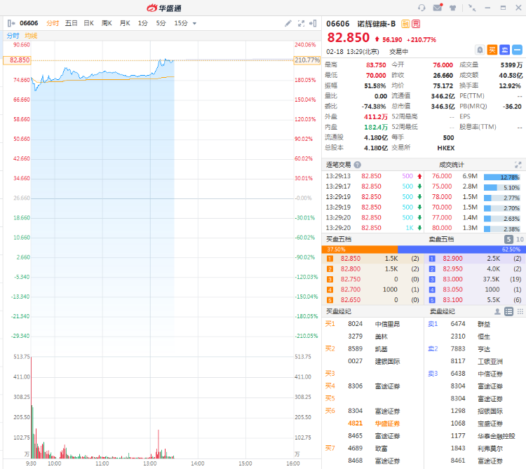 2月18日消息,诺辉健康今日在港交所上市,午后直线拉涨,截至发稿,诺辉健康涨210.77%,报82.85港元,最新市值346.2亿港元。