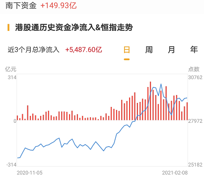 南下资金今日净流入港股高达149.93亿港元。