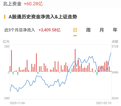 北上资金今日净流入60.28亿元。