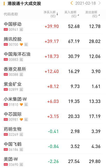 个股方面,今日南下资金净买入中国移动39.9亿港元,为今日买入之最。此外,南下资金净买入腾讯控股39.17亿港元,净买入中国海洋石油18.73亿港元。
