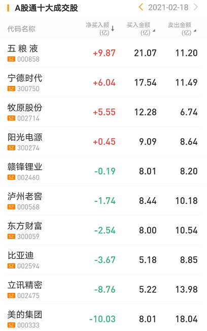 北上资金今日净买入五粮液9.87亿元,为今日买入之最。此外,北上资金今日净买入宁德时代6.04亿元。