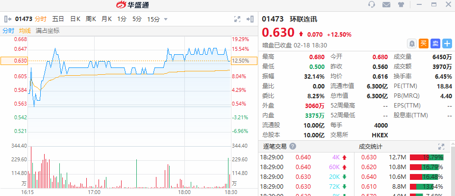 华盛资讯2月18日讯,环联连讯(06606)暗盘收盘报价0.63港元,涨幅为12.5%,一手账面盈利280港元。暗盘成交额3970万港元,该股将于明日正式上市。