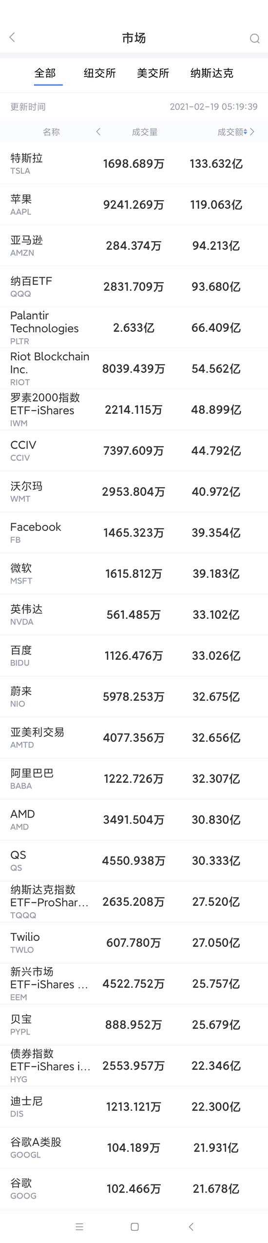 以下为美股当日交易最活跃的20只股票(按成交额):