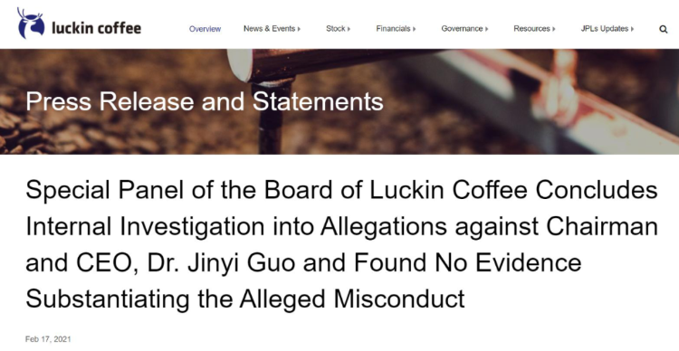 2月17日,针对此前多位高管联名举报瑞幸咖啡现任董事长兼CEO郭谨一贪污一事,瑞幸咖啡发布调查报告称,瑞幸特别工作组聘请了外部法律顾问和法证专家组成调查组进行独立调查,目前显示“没有发现任何证据证明郭谨一存在请愿信中所指控的不当行为,瑞幸咖啡董事会将继续全力支持郭博士和其管理团队。”