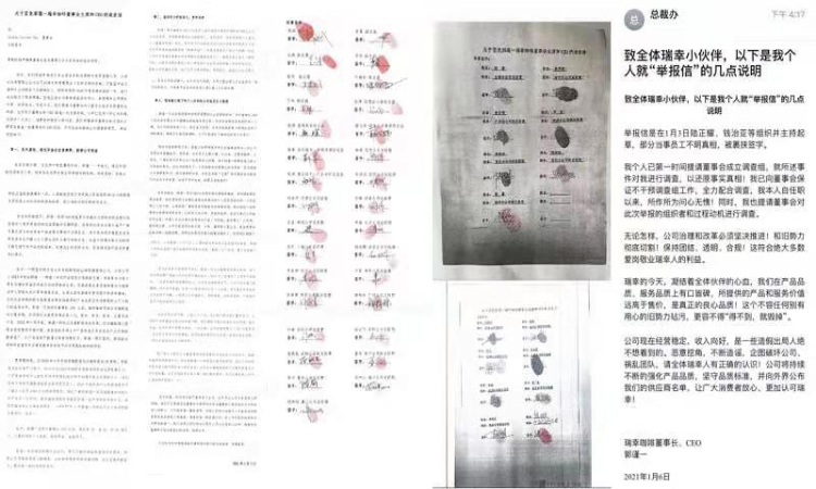 该联名信表示,郭谨一贪污腐败损害公司利益、滥用权力铲除异己、能力低下等,要求罢免其职位。随后,郭谨一发布全员信称,该举报信是陆正耀、钱治亚等于1月3日主持起草,部分当事员工不明真相,被裹挟签字,已于第一时间提请董事会成立调查组,以还原事件真相。其还表示:“公司现在经营稳定,收入向好,是一些造假出局人绝不想看到的”,瑞幸的今天容不得“得不到,就毁掉”。