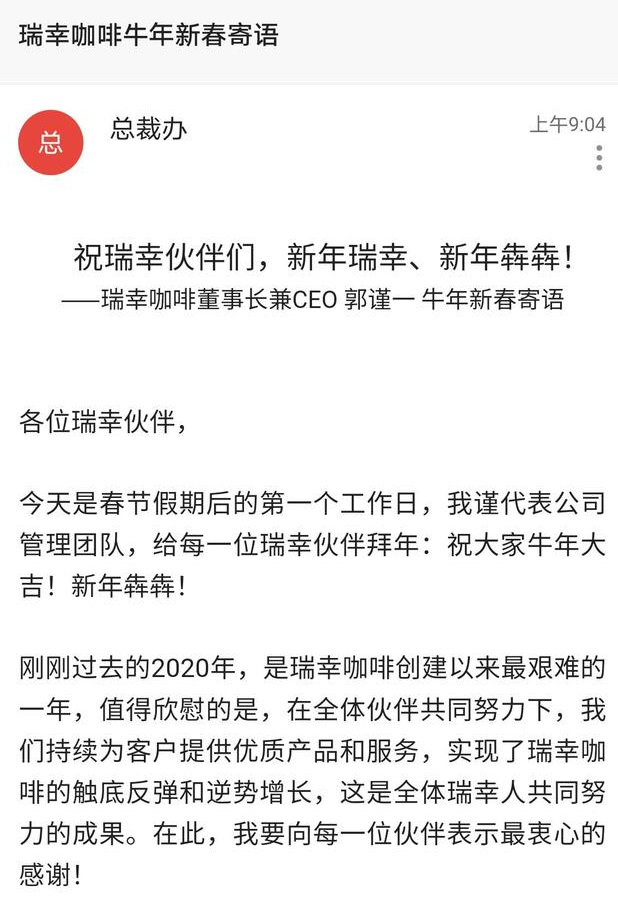 郭瑾一在信中表示:“刚刚过去的2020年,是瑞幸咖啡创建以来最艰难的一年,值得欣慰的是,在全体伙伴共同努力下,我们持续为客户提供优质产品和服务,实现了瑞幸咖啡的触底反弹和逆势增长。”