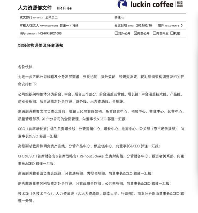 值得一提的是,与内部信同时公布的,还有一份来自人力资源部的瑞幸咖啡组织架构调整及任命通知的文件。