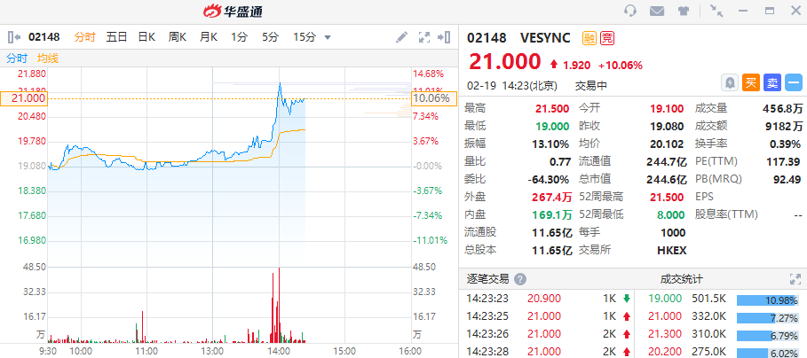 华盛资讯2月19日消息,小家电次新股VESYNC(02148)午后短线拉升,创历史新高,盘中最高见21.5港元。截至发稿,VESYNC涨10.06%,报21港元每股,暂成交9182万,当前总市值达244.6亿港元。