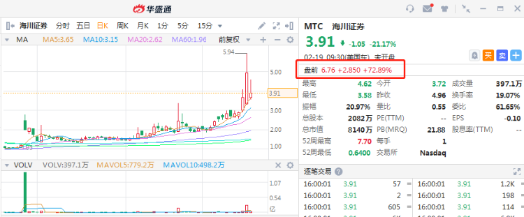 华盛资讯2月19日消息,美股盘前,海川证券一度涨超80%,截至发稿涨近73%。此前外汇局官员称正研究论证允许境内个人在年度5万美元便利化额度内开展境外证券、保险等投资的可行性。