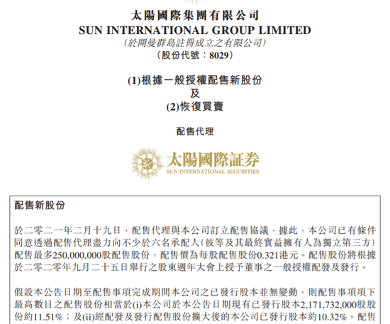 太阳国际(08029)发布公告,于2021年2月19日,公司拟配售最多2.50亿股配售股份,相当于公司于本公告日期现有已发行股本约11.51%;及经扩大后的公司已发行股本约10.32%。配售价为每股配售股份0.321港元。配售完成后,公司大股东持股从66.08%稀释为59.26%,公司已向联交所申请,股份由2021年2月22日上午九时正起恢复于联交所买卖。