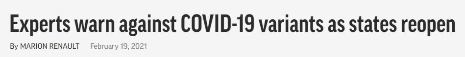 瓦伦斯基:“我们估计,全美目前4%的确诊病例与在英国发现的变异毒株有关。我们还预测,到3月底,这种变异毒株可能成为在美国传播的主要新冠病毒。”