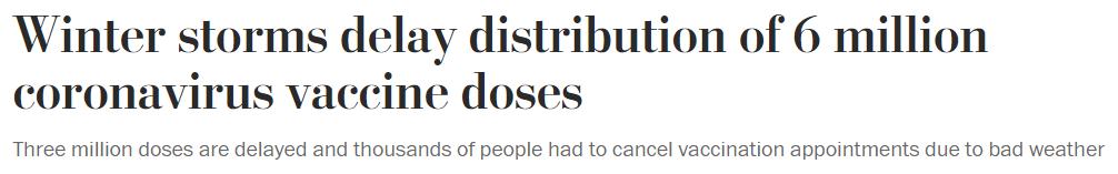 屋漏偏逢连夜雨。近日美国多地受冬季风暴影响,疫苗运输和交付工作也出现延误。据《华盛顿邮报》报道,全美推迟了至少600万剂疫苗的分发,至少15个州的疫苗接种点关闭,预约接种工作只能另行安排。
