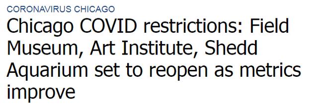 芝加哥已允许恢复室内用餐,并在限制人数的条件下重新开放了菲尔德博物馆、芝加哥美术馆和谢德水族馆等主要景点;波士顿开放了体育馆、电影院和观光海港巡游;纽约市的餐厅也为室内用餐开了绿灯……