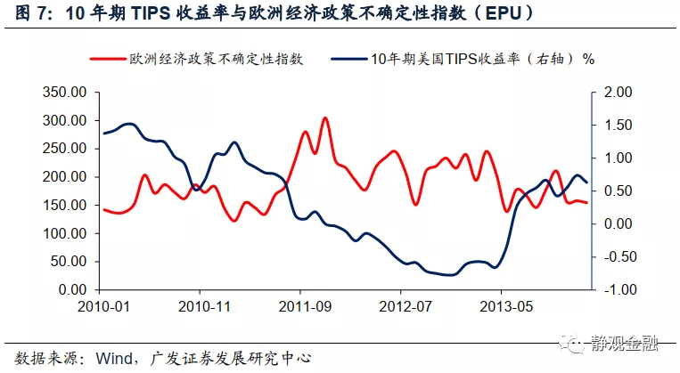 图6所示2013年意大利与德国10年期国债差值中枢显著下移,而2013年5月欧洲经济政策不确定性指数由前值的205.6降至139.1,表明此时市场对于欧债危机的担忧大大缓解。而2013年5月也刚好是10年期美国TIPS收益率开始飙升的时间。此处会有人提问“2013年5月22日美联储前主席伯南克宣布年底要削减QE才是美债收益率飙升的原因吧?”但是从日度数据上我们不难发现2013年5月1日-20日10年期美国TIPS收益率已经从-0.64%升至-0.31%,即回升33BP;只不过在伯南克宣布日后削减QE后10年期TIPS收益率继续加速攀升而已。也就是说,欧债危机解除、避险因素消失大概率是2013年Q2改变美国实际利率走势的基本面动力,货币政策转向预期则是加速器。
