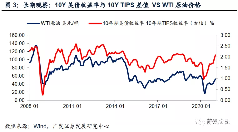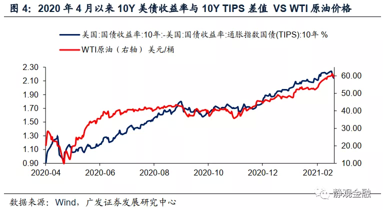 10年期美债收益率代表名义利率、10年期TIPS代表美国实际利率。经验上,10年期TIPS会受到实际增长、配置及避险等因素影响,而10年期美债收益率与10年期TIPS收益率差值则在反映通胀。结合图2-3可知,10年期美债收益率与10年期TIPS差值与WTI原油价格的长期相关度显著高于该差值与美国CPI同比的相关度,换言之10Y美债收益率与10Y TIPS的差值反映的是通胀预期而非通胀本身。去年11月以来甚至去年5月以来10年期TIPS基本处于底部震荡,而二者差值持续走阔并推动10年期美债收益率持续攀升,可见此间通胀预期是10年期美债收益率上行的主要驱动力,这与同期油价上行一致。