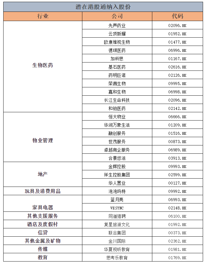 光大证券发表报告指,根据多个准则,估计29只港股有望在下月获纳入港股通名单。光证估计获纳入公司中,以生物医药,物业管理,休闲娱乐和家具家电等消费类公司为主,占比在八成以上。若顺利纳入,供内地投资者买卖的医药和消费类公司比重,有望进一步上升。