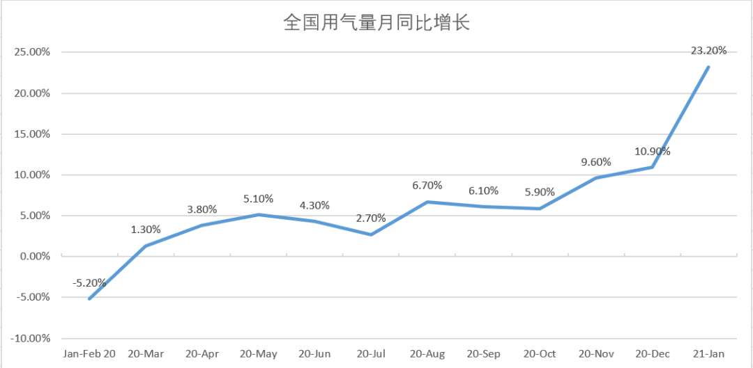 从短期看,在经济逐渐摆脱疫情阴霾以及冬季供暖需求下,天然气用量近几月出现大幅恢复,在今年1月份甚至同比上涨23%