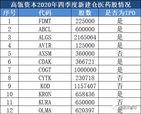 7只IPO新股:高瓴资本素以参与医药股的IPO著称,与港股医药股不同,由大机构加持的美股医药股的IPO大部分涨势很好,高瓴资本清仓、减仓最频繁的就是IPO新股,但此类投资一般仓位不大,仓位较重的新股往往不会在解禁前就出掉;