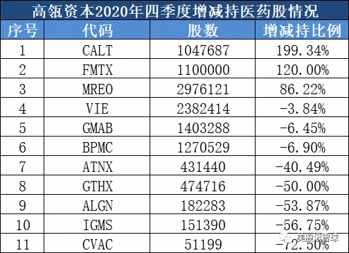 CVAC是一家做COVID-19的mRNA疫苗公司,IGMS因四季度发布的数据不错而暴涨;ATNX和GTHX都是在今年一季度有PDUFA而大幅减仓,看来高瓴也不喜欢赌药物审批;