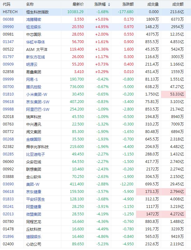 其他成分股,小米跌0.65%,舜宇光学跌1.96%,猫眼娱乐、微盟集团跌超4%,心动公司跌超5%