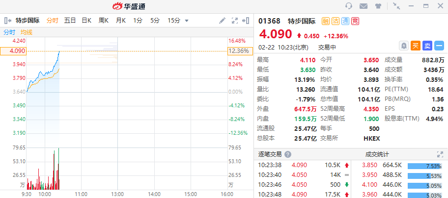华盛资讯2月22日消息,特步国际盘中异动,快速拉升超12%。截至发稿,特步国际涨12.36%,现报4.09港元,暂成交3436万,当前总市值为104.1亿港元。