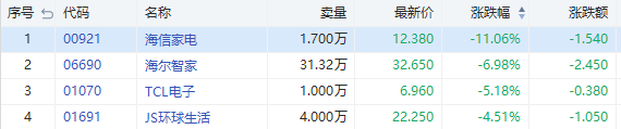 华盛资讯2月22日消息,港股家电股延续下行行情,截至发稿,海信家电跌11.06%,海尔智家跌6.98%,TCL电子跌5.18%,JS环球生活跌4.51%。