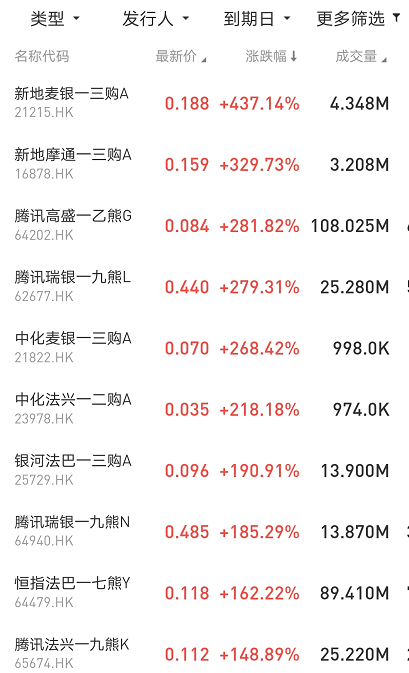 新地麦银一三购A(21215)涨437.14%占据涨幅榜第一。其次是新地摩通一三购A(16878)涨329.73%、腾讯高盛一乙熊G(64202)涨281.82%。