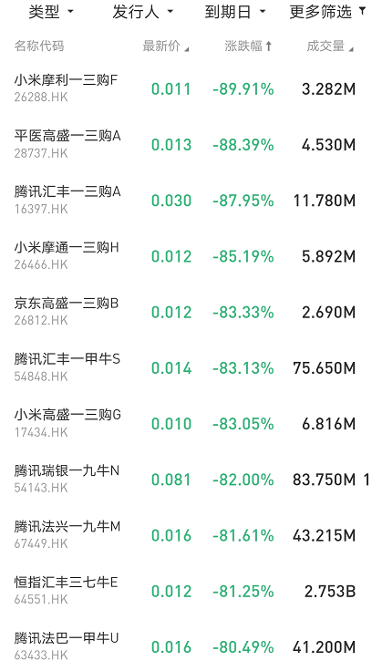 值得注意的是,腾讯今日有4只轮证涨幅在100%以上。