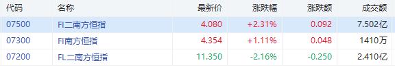 南方两倍看多恒指(07200.HK)涨2.31%,成交额达2.71亿港元,南方一倍看空恒指(07300.HK) 涨1.11%,成交额达1505万港元,南方两倍看空恒指(07500.HK) 跌2.16%,成交额达4.71亿港元。