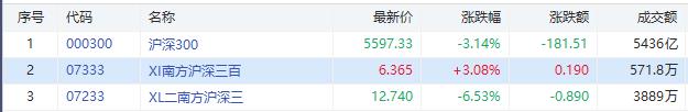 沪深300跌0.89%,南方两倍做多沪深300(07233.HK) 跌6.53%,成交额3889港元,南方一倍做空沪深300(07333.HK) 涨3.08%,成交额571.7港元。