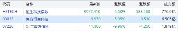 恒生科技指数今日高开低走,收跌5.53%,南方两倍做多恒生科技(07226.HK) 跌5.05%,成交额6.5亿港元,南方恒生科技(03033.HK) 跌9.96%,成交额1.88亿港元。