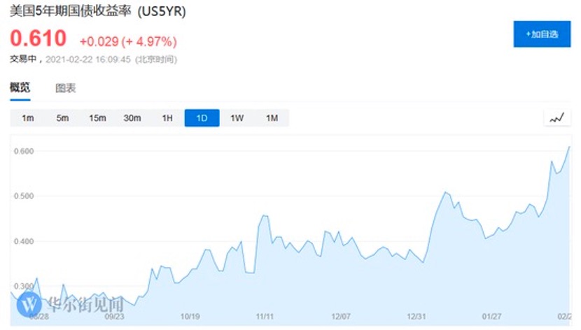 最新消息显示,5年期美债和30年期收益率曲线创下2014年以来的最陡峭水平。截至发稿,5年期美债收益率报0.603%、30年期美债收益率报2.173%。