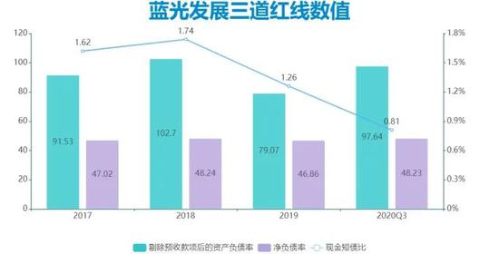 据了解,2020年三季度,蓝光剔除预收账款后资产负债率为48.23%,净负债率为97.64%,现金短债比0.81。值得注意的是,在2019年末,蓝光净负债率还是79.07%,最新披露的数据按年增长18.57个百分点。