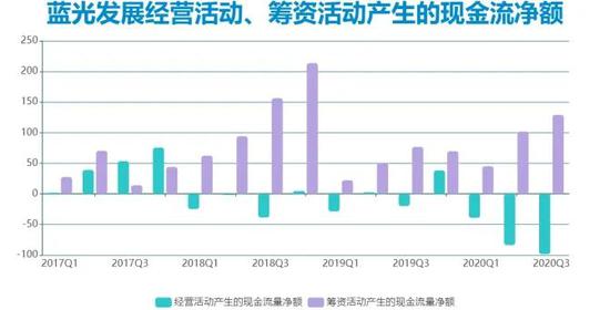 数据显示,2020年前三季度,蓝光筹资活动产生的现金流量净额分别为45.15亿元、101.77亿元、128.99亿元,同比分别增长103.81%、99.90%、68.20%。