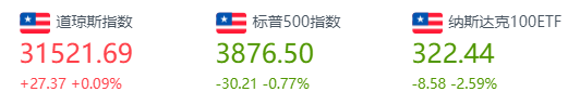 周一美股收盘,道琼斯指数涨0.09%,报31521.69点;标普500指数跌0.70%,报3879.30点;纳斯达克综合指数跌2.46%,报13533.05点。