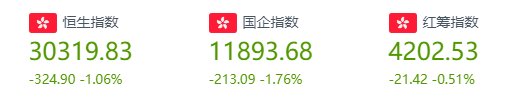 周一,恒生指数跌324.9点或1.06%,报30319.83点,全日成交额达3025.88亿。国企指数跌1.76%,报11893.68点,红筹指数跌0.51%,报4202.53点。
