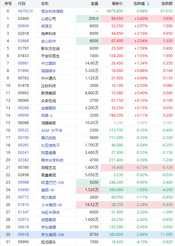 其他成分股,阿里跌近1%,美团跌超1%,小米、京东、微盟集团跌超2%,祖龙娱乐跌超4%。