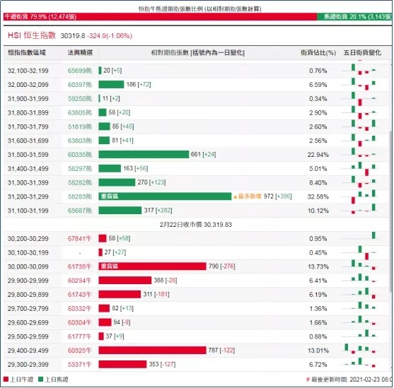 街货分布方面,至周一,恒指牛证街货在收回价29800点至30300点之间,相当约1574张期指合约;恒指熊证街货在收回价31100点至31600点之间,相当约2383张期指合约。