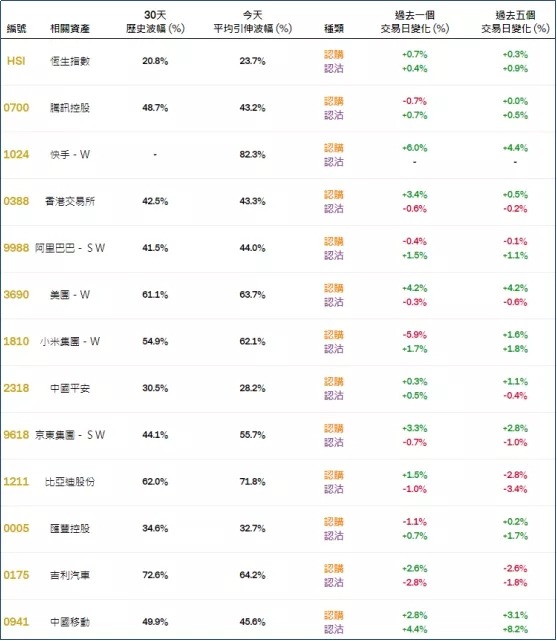 周一恒指相关权证的平均引伸波幅约23.7%,按日有所上升。个股方面,快手、港交所、美团、京东相关认购证的引伸波幅均有明显调升,小米相关认购证的引伸波幅明显调降。