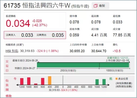 2、看错方向:恒指法兴四六牛(61735.HK),周一下跌42.37%。