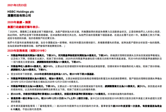 2月23日消息,汇丰控股(00005.HK)发布2020年年度业绩,2020年全年营收504亿美元,去年同期560.98亿美元。列账基准除税后利润为61亿美元,下跌30%,而列账基准除税前利润则为88亿美元,下跌34%。拟每股派0.15美元。