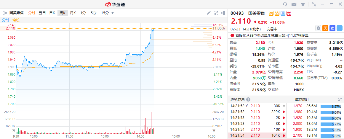 华盛资讯2月23日消息,国美零售盘中异动,获快速拉升超11%。截至发稿,国美零售涨11.05%,现报2.11港元每股,暂成交6.359亿,当前总市值为454.7亿港元。