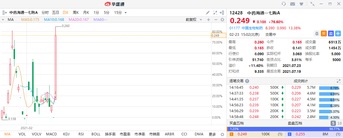 中药海通一七购A(12428)涨76.6%,成交额达1457万港元。