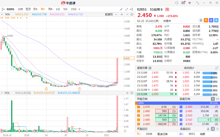 2月23日消息,51信用卡持续走高,飙升172%,现报2.45港元,最新市值33亿港元,。