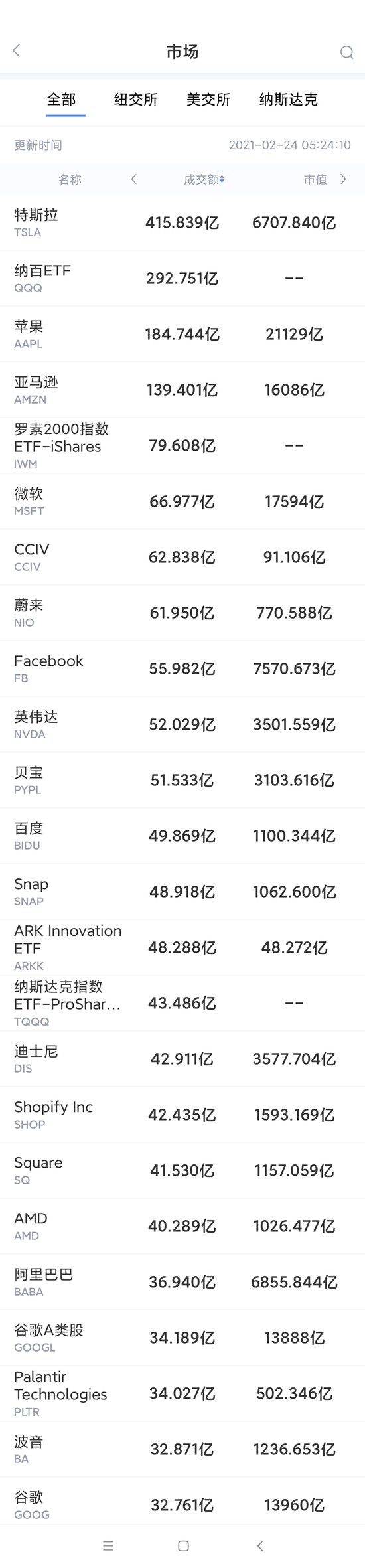 以下为美股当日交易最活跃的20只股票(按成交额):