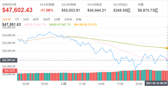 截至24日0点30分,比特币跌至47602美元/枚。在24小时内,比特币一度跌破了45000美元。在去年一年时间里,比特币总共上涨了243%,近日创纪录涨破58000美元。